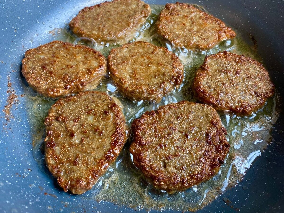После того как тесто настоялось, его следует выкладывать столовой ложкой на предварительно разогретую сковороду с растительным маслом, обжаривая по 3-4 минуты с каждой стороны на умеренном огне. Готовые оладьи могут подаваться с соусом или без него — они вкусны и так, и так.